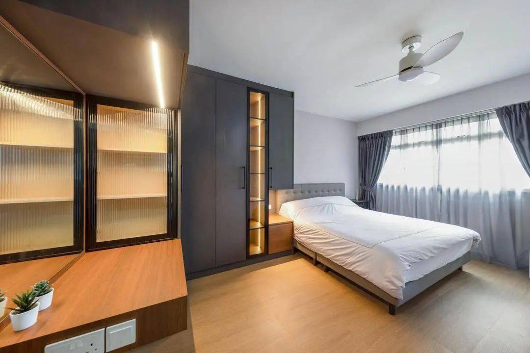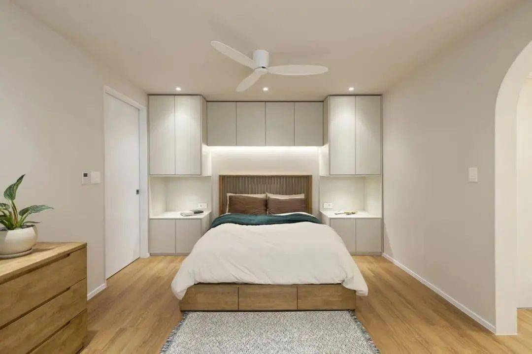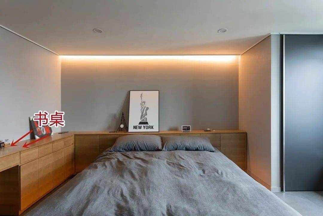 整面衣柜留空设计置物区,半护墙+置物区的一体化设计把床头柜省了,让空间的整体感更好,让卧室更显得干净、利落。