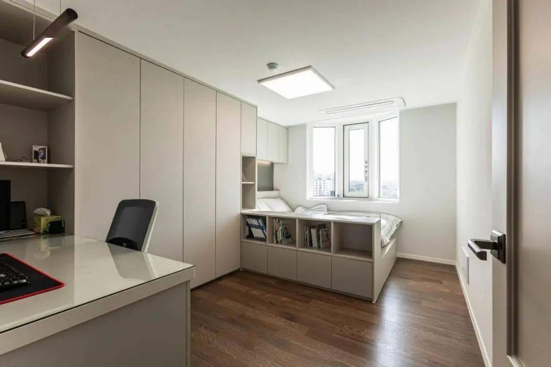 床头整面收纳柜延伸出地台床、学习区,将收纳空间增加到最大化,一面柜子完美满足屋主对于舒适生活的追求。