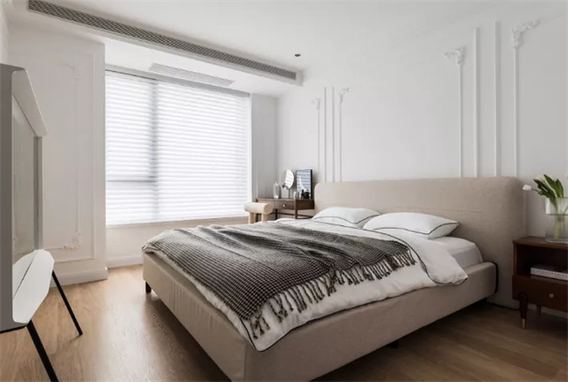 主卧延续简约舒适风格,雅白墙面装饰PU线条和精致角花,与白色踢脚线融为一体,空间视觉统一性更强。