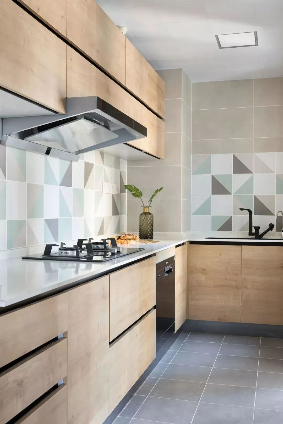 厨房深色地砖+浅灰色墙砖+彩色灰白青花砖+原木色橱柜搭配设计,使整个厨房空间显得更加清新自然,让下厨者的心情都更加轻松。