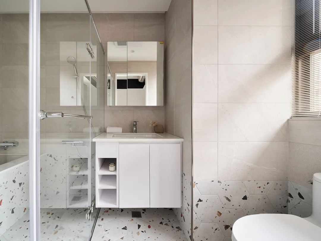 由浴柜和镜子构成的迎门画面,巧妙回避了极需隐私的马桶和洗浴区。